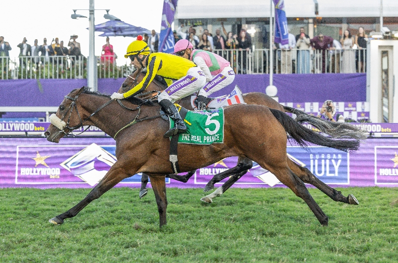 Jockey Craig Zackey (L) rides "The Real Prince" on his way to the finish line to win the 2025 edition of the Durban July. (Getty)